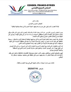 يعرب المجلس السوري الفرنسي عن أشد درجات الإدانة والاستنكار للعدوان الإسرائيلي الذي طال مواقع مدنية وعسكرية في العاصمة دمشق ومحافظتي السويداء ودرعا، مما أدى إلى وقوع شهداء وجرحى، في انتهاك صارخ لأحكام القانون الدولي وميثاق الأمم المتحدة.